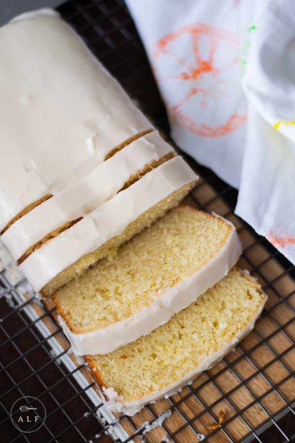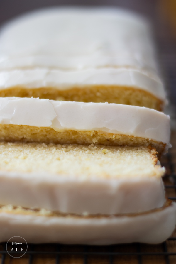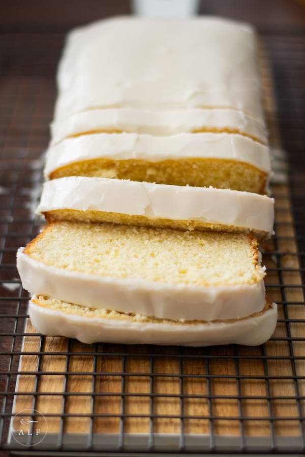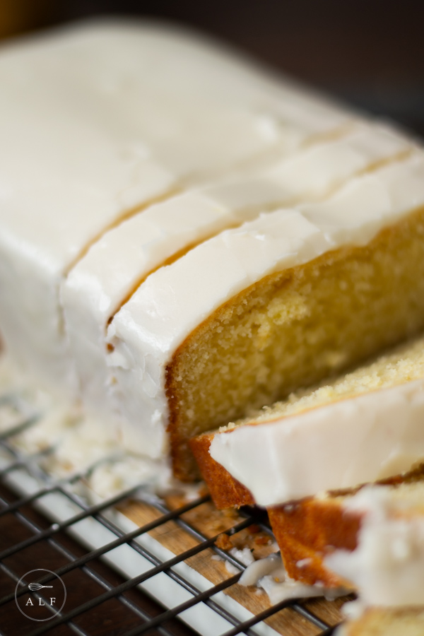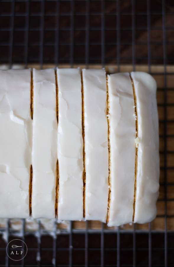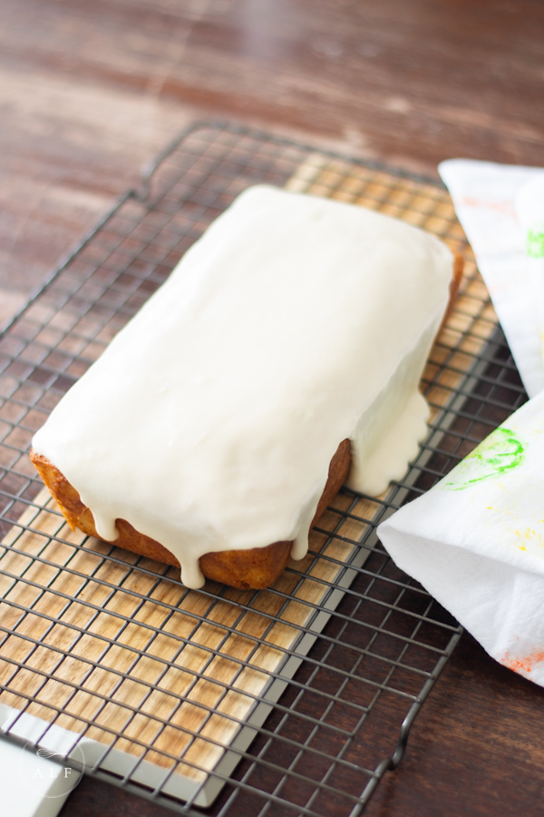 - When the loaf cake is completely cool, pour the icing over the entire top and let it drip down over all the edges.