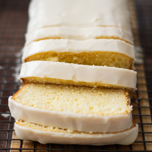 - When the loaf cake is completely cool, pour the icing over the entire top and let it drip down over all the edges.